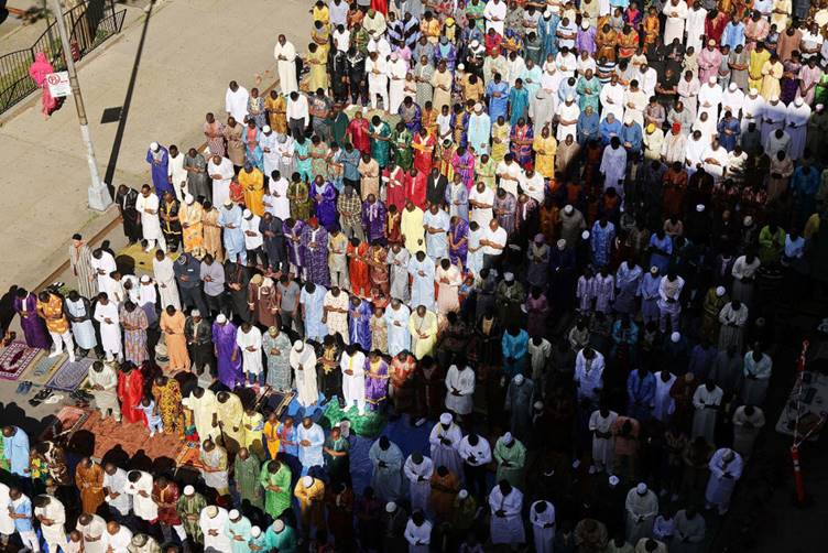 開齋節當天,當地穆斯林民眾在紐約阿克薩賽倆木清真寺參加開齋節會禮。阿克薩賽倆木清真寺是曼哈頓地區最古老的西非風格清真寺。