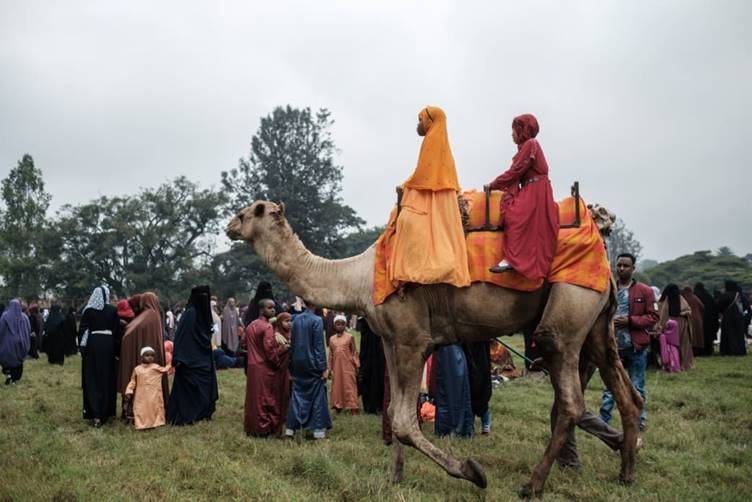 、開齋節會禮之後,兩名穆斯林小女孩嘗試駱駝坐騎。