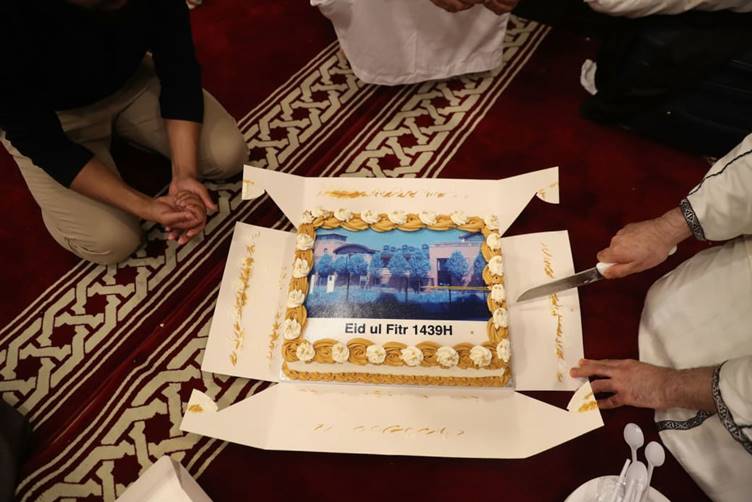 民眾在清真寺內切割定制蛋糕,歡慶開齋節。