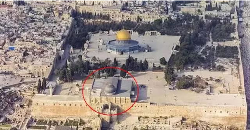 阿克薩清真寺與圓頂清真寺示意圖,紅圈內為阿克薩清真寺,圍牆內所有區域皆屬於阿克薩清真寺。