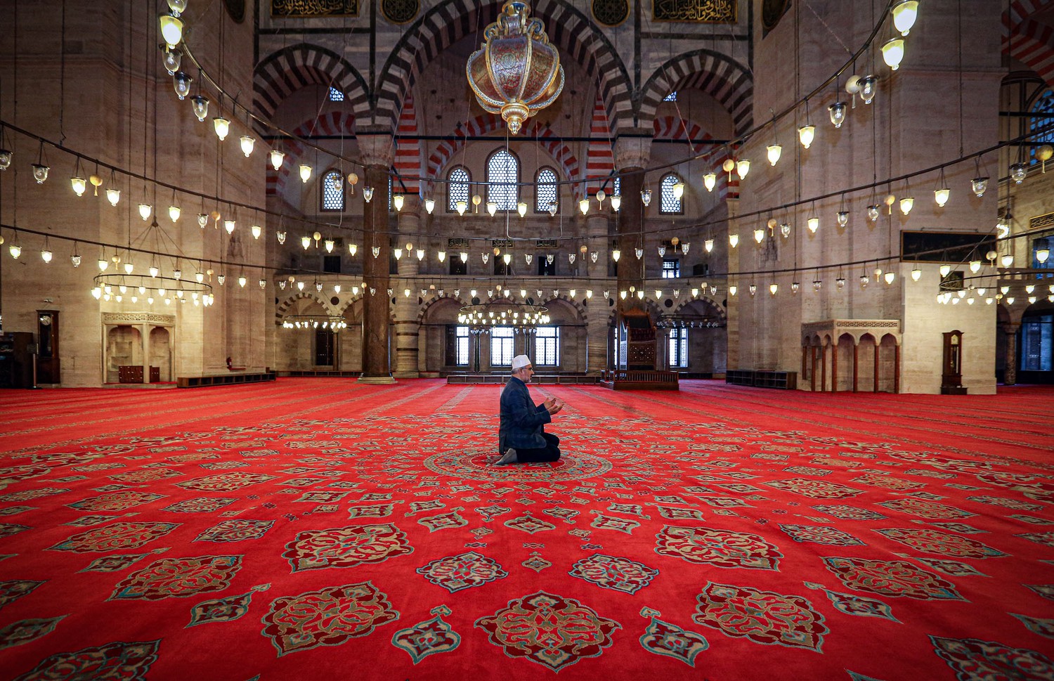 2020年4月28日,土耳其首都伊斯坦布爾,疫情期間,各地清真寺被迫關閉,一名男子在蘇萊曼清真寺獨自禮拜。