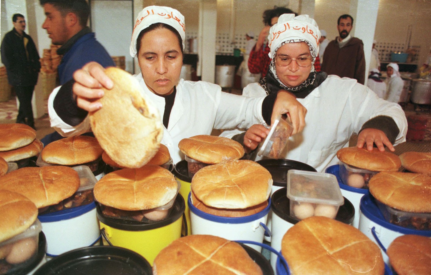 1988年,摩洛哥首都拉巴特,摩洛哥國家福利中心志願者為貧苦民眾準備免費開齋飯。據記載,當時志願者每天都會發放3.5份免費開齋飯。