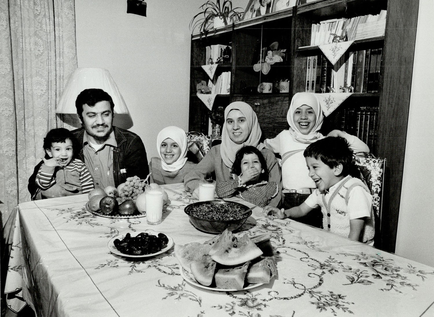 1988年,加拿大,拉凱一家人歡慶齋月的到來。圖中從左往右:阿伊莎(16個月),阿里(35歲),娜比拉(7歲),奈米哈(31歲),法蒂瑪(3歲),祖拜達(8歲),艾哈邁德(5歲)。