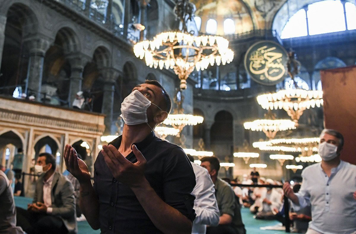 土耳其首都伊斯坦布爾,穆斯林佩戴口罩在索菲亞大清真寺禮拜、祈禱。
