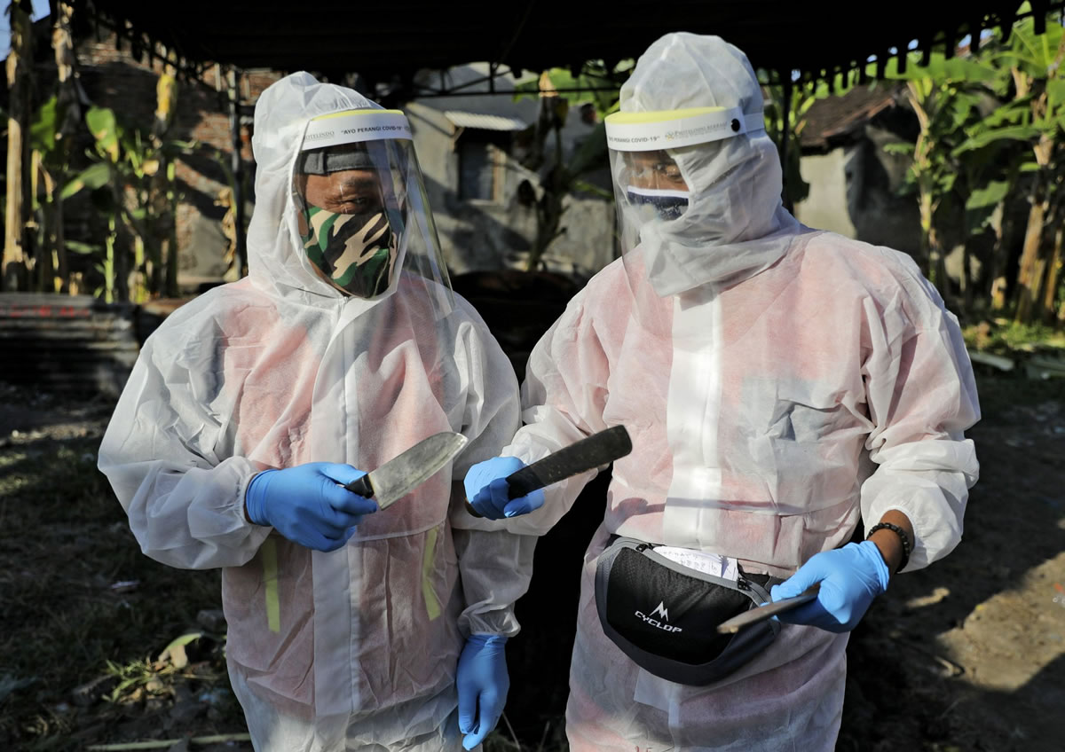 印尼蘇臘巴亞,穆斯林對刀具消毒後穿戴防護用品準備宰牲。