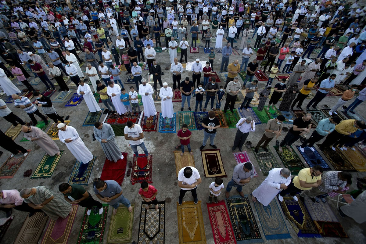 以色列特拉維夫,巴勒斯坦穆斯林在公園完成古爾邦會禮。疫情期間,以色列政府規定每座清真寺禮拜人員不得超過十人。