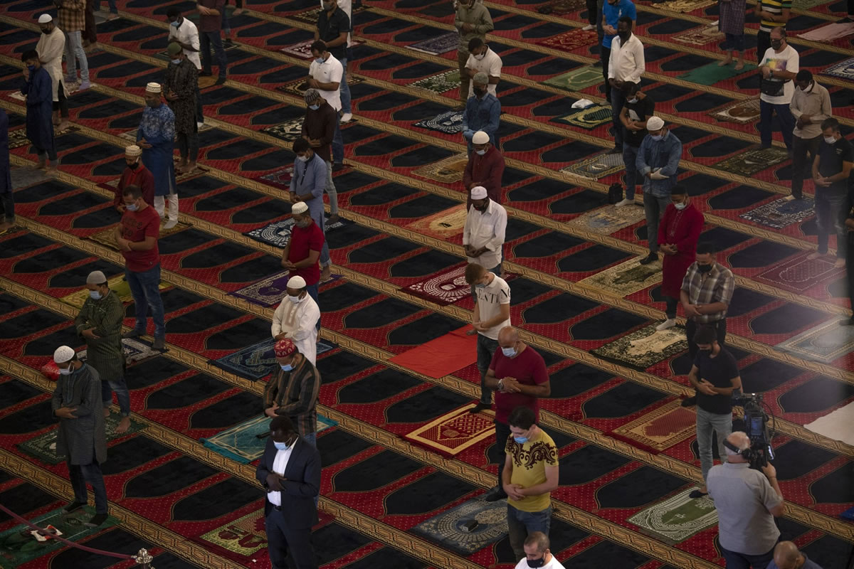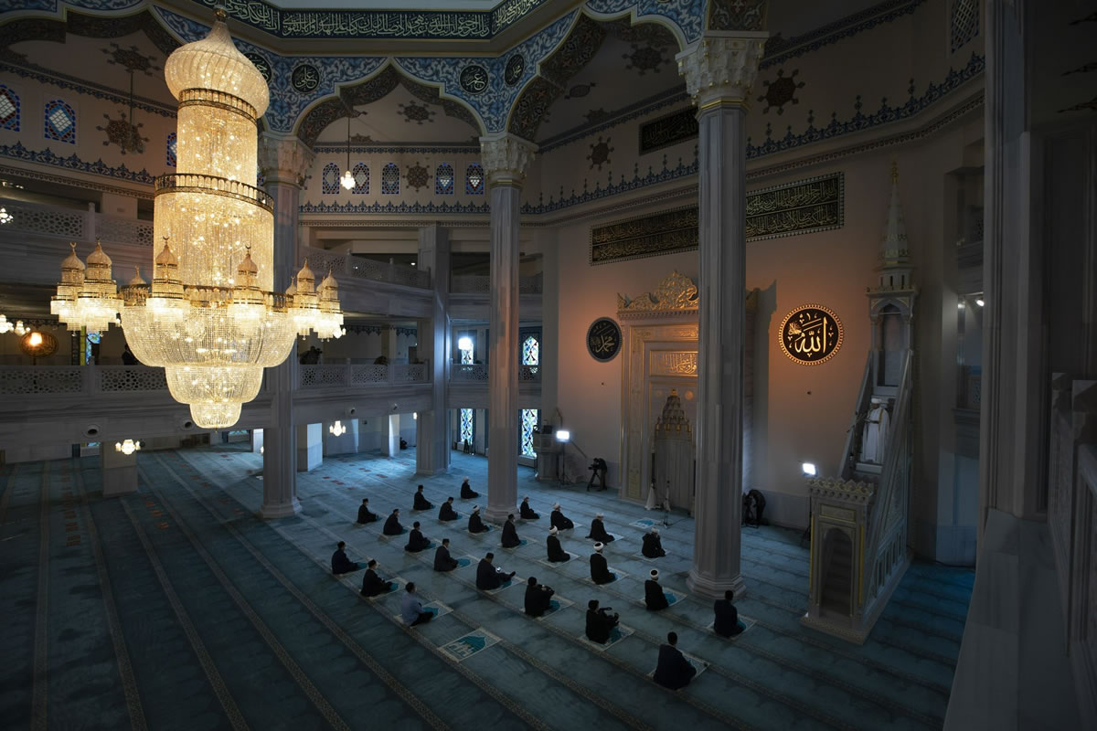 俄羅斯首都莫斯科,清真寺教職人員在空曠的清真寺拉開安全距離等候會禮的開始。