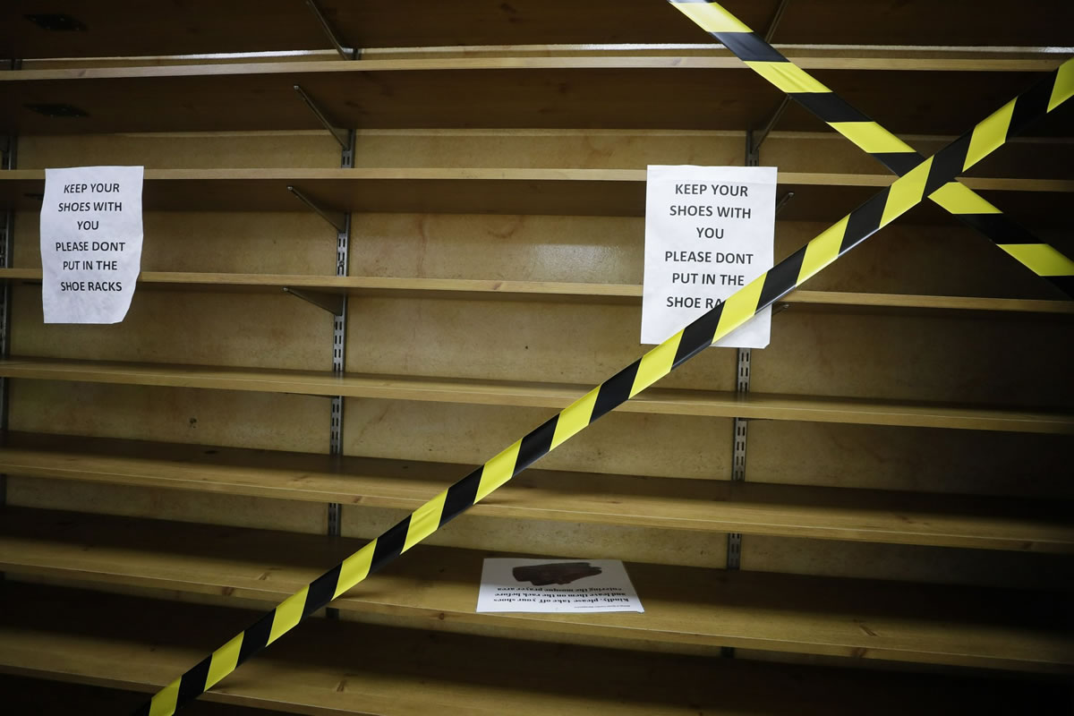 英國倫敦,敏哈吉•古蘭清真寺,清真寺管理人員用膠帶封住鞋架,以免人員聚集。