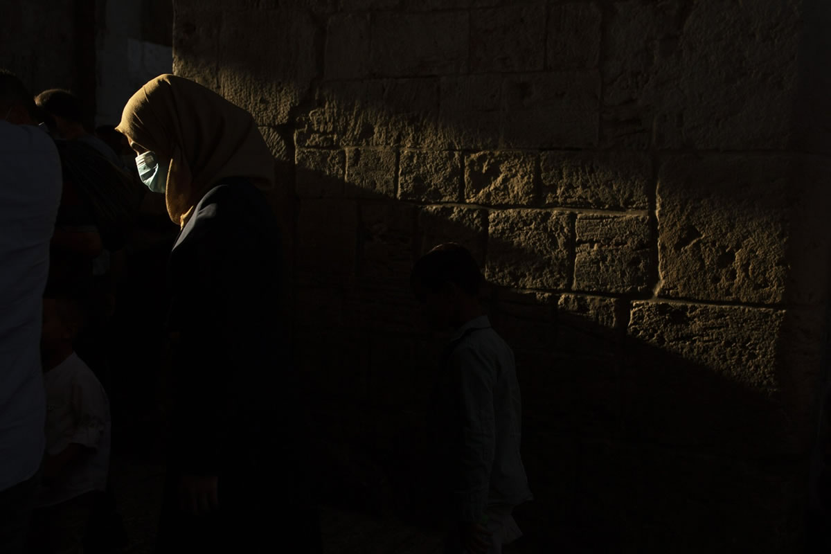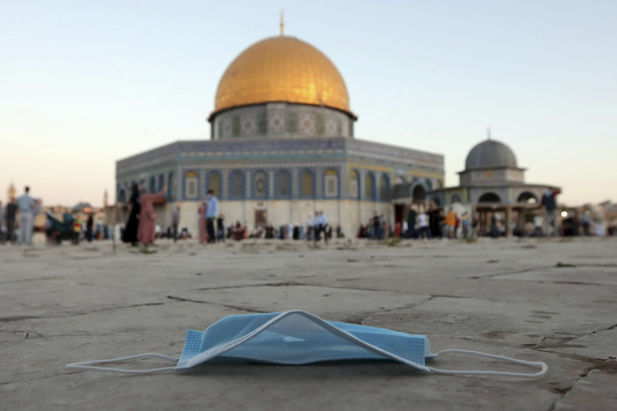 聖城耶路撒冷,一名穆斯林女子完成古爾邦會禮後佩戴口罩離開清真寺。