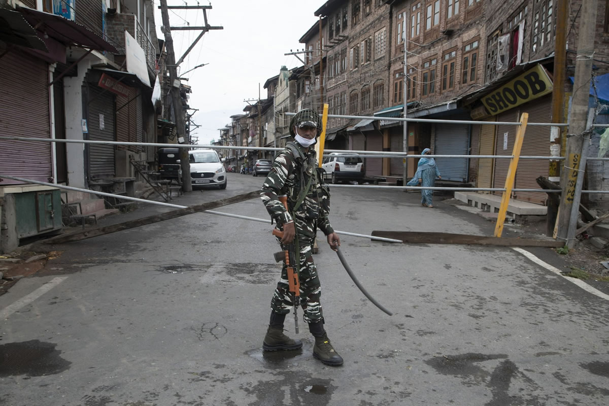 印控喀什米爾地區,一名印度軍警在封鎖路段進行警戒。