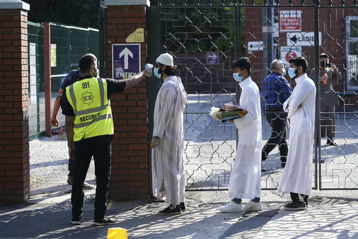 英國倫敦,曼徹斯特清真寺,當地穆斯林佩戴口罩排隊等待安保人員測量體溫進入清真寺禮拜。