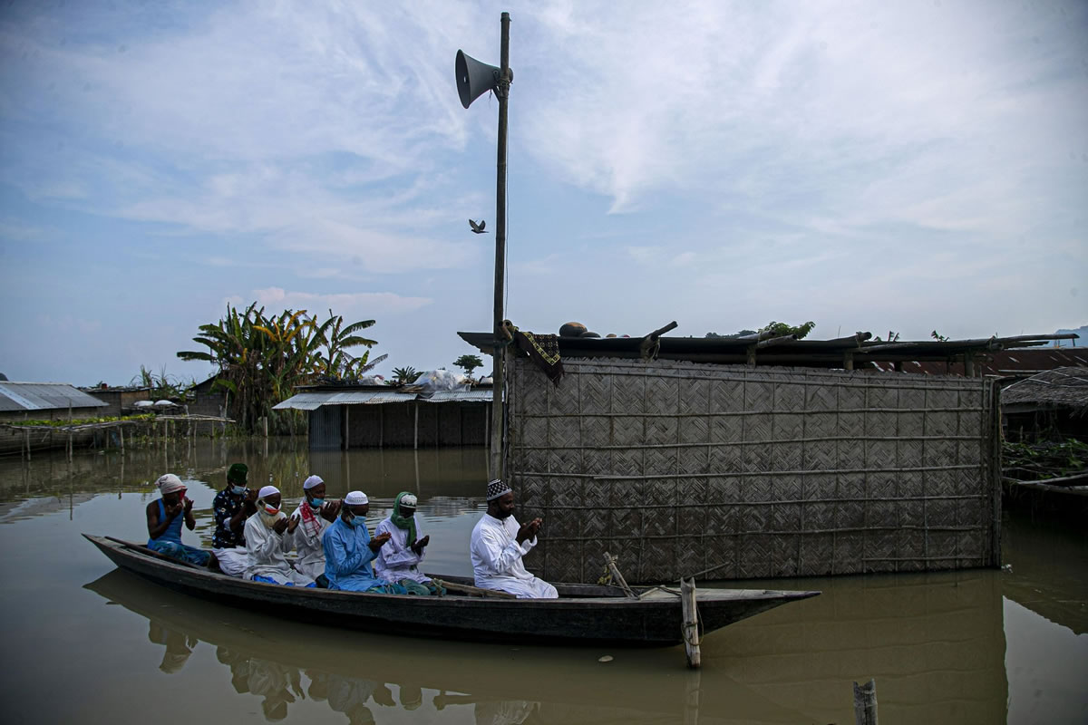 印度阿薩姆,一群穆斯林在船上完成古爾邦會禮。小船旁邊,是這群穆斯林的清真寺,清真寺已經淹沒在洪水之中。