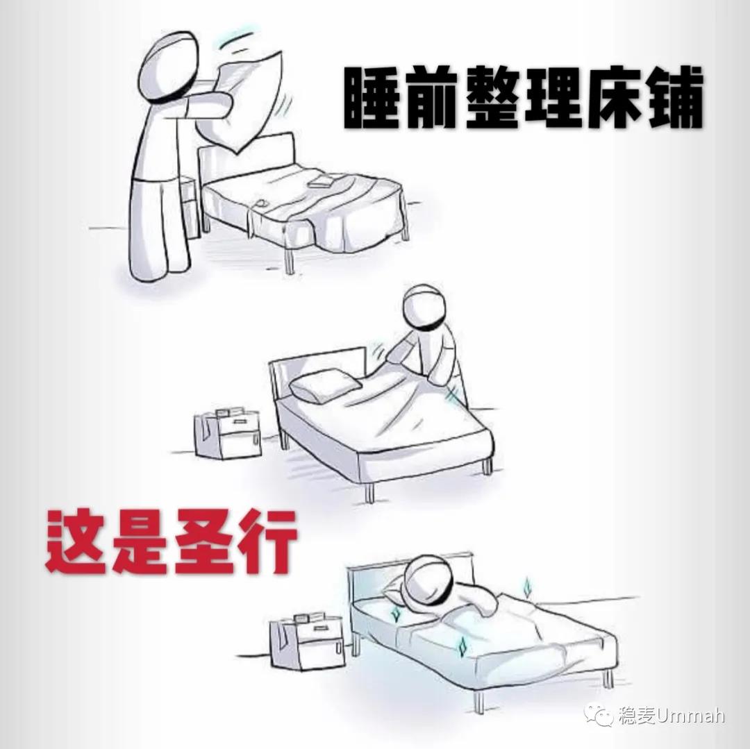 據艾布·胡萊賴傳述,先知ﷺ說:“你們中一個人上床睡覺時,[睡覺前]用他的裹裙裡子拂抖床鋪,因為他不知道床上落下了什麼東西,然後念:‘我的主啊!我以你的尊名睡下,以你的尊名起床,如果你收回我的生命,求你慈憫它,如果你讓它繼續生活,求你如同保護你廉潔的僕人一樣保護它。’”——《布哈里聖訓實錄全集》