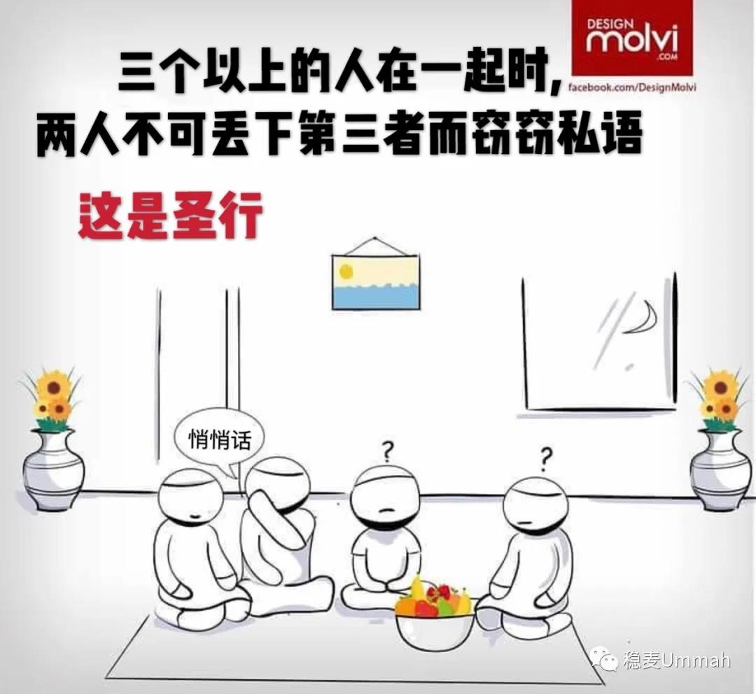 據阿卜杜拉·本·邁斯歐德說,先知ﷺ說:“如果你們三個人在一起時,兩人不可丟下第三者而竊竊私語,你們應跟大家在一起談話,以免使第三者傷心。”——《布哈里聖訓實錄全集》