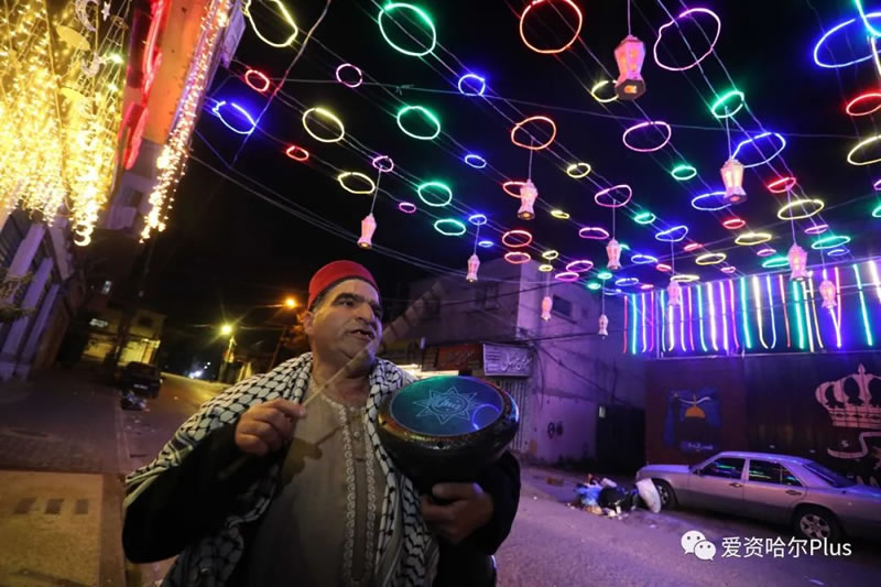 在加沙,仍然保存在清晨的打更叫醒睡夢人的傳統,這位哈米斯大叔,在半夜之後,走街串巷,敲打著的傳統的小鼓,喚醒人們起來吃封齋飯。