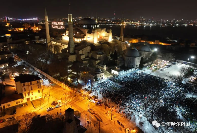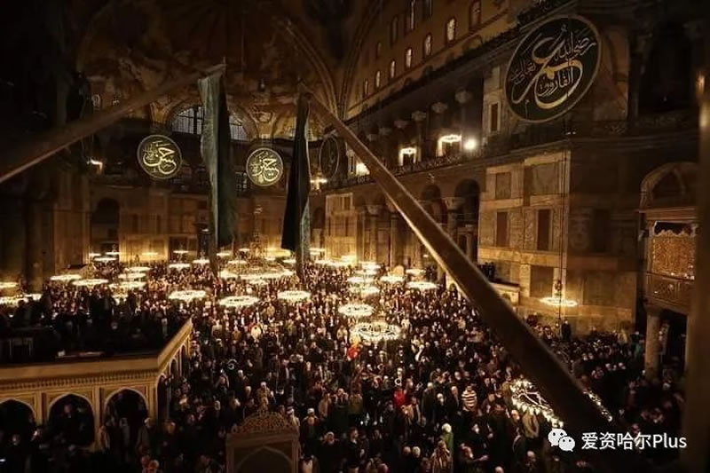讓我們先來到土耳其著名的地標建築阿雅·索菲亞,在這座歷經88年的風霜後,首次在萊麥丹月中聚禮間歇拜。早早前來的人們擠滿了整個大廳,座無虛席,以至於在外面的庭院裡也是人滿為患,在間歇拜之前,大家不約而同聲音渾厚地贊念著,等待著這一歷史時刻的到來,88年的等待,終於在今天迎來了萬眾彙聚的日子!