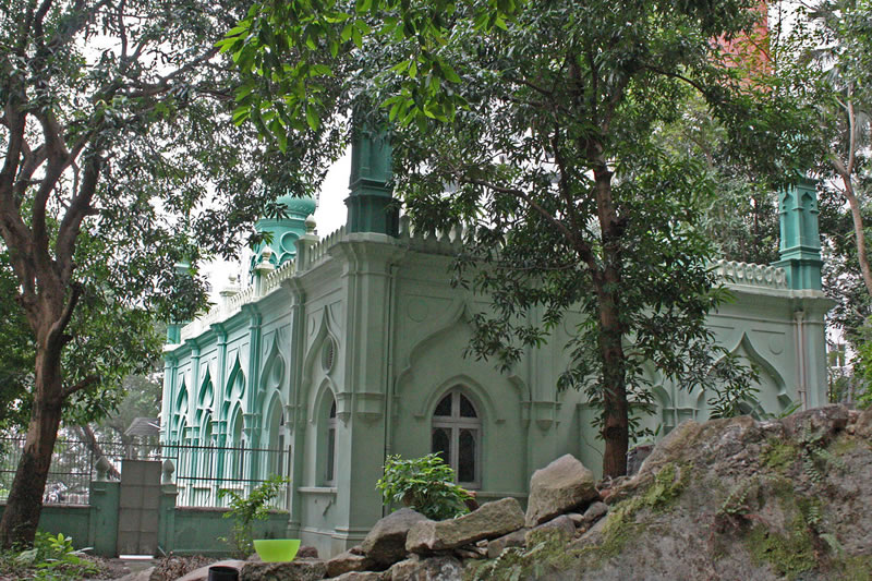的連 接 橋。正 門 門 廊和 小 庭院 鋪 有雲 石地磚,建有矮圍牆圍 繞,上方蓋有 簷 篷 和後來加建的 鐵皮屋頂。這空間 是 潔 淨與不潔的分界線,信徒及訪客必須在門廊脫鞋 後才能進 入禮拜殿。禮拜殿有入口三處,內部沒有間隔,朝拜牆 設 於禮拜殿盡頭。信徒在進入清真寺禮拜 前 需洗滌雙手、面部、手肘、頭部、雙腳和足踝 ,而盥洗區設 在清真寺教徒住所 (Musafir Khana)旁邊 , 與清真寺完全分離 。