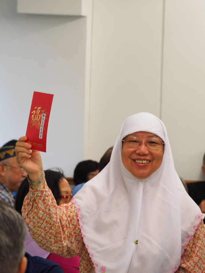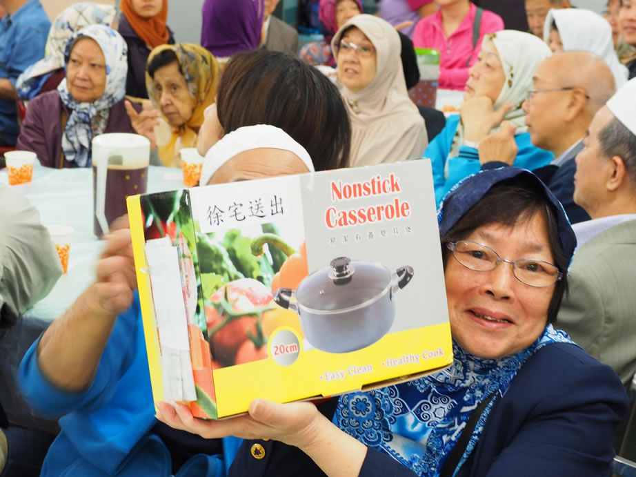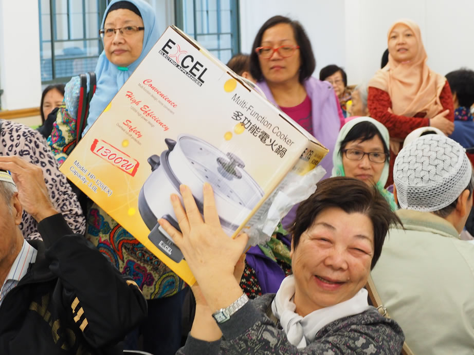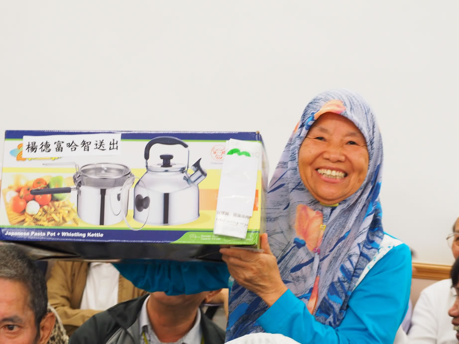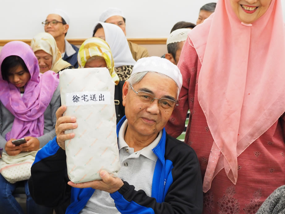 社薩智生主席和楊秘書長、楊興文阿訇及其他執委亦一早到社恭候長者們的到來,在2/F大堂禮品琳瑯滿目,這些利士及禮券、餐券,禮品等來自我們的社員、教胞的捐贈。