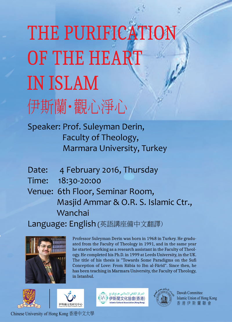 講座:伊斯蘭.觀心.淨心 穆斯林 2016-01-29 17:17:54 瀏覽 Talk: The Purification of the Heart in Islam 講座:伊斯蘭.觀心.淨心 (英文講座備中文翻譯) 4 Feb (Thu) 6:30pm- 8:00pm @ 6/F Seminar Room 2月4日(星期四) 下午6時30分- 8時@六樓研討室