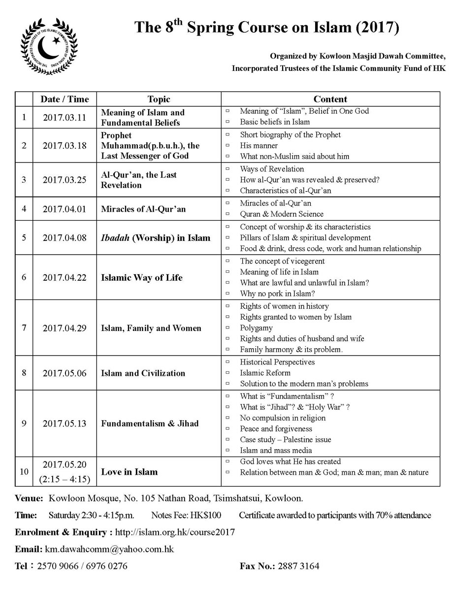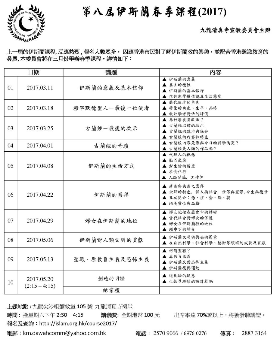 第八屆伊斯蘭春季課程 (2017) 穆斯林 2017-02-20 20:34:18 瀏覽 報名及查詢:http://islam.org.hk/course2017/ 點擊這里查看詳細課程(中文)>>> 點擊這里查看詳細課程(英文)>>>
