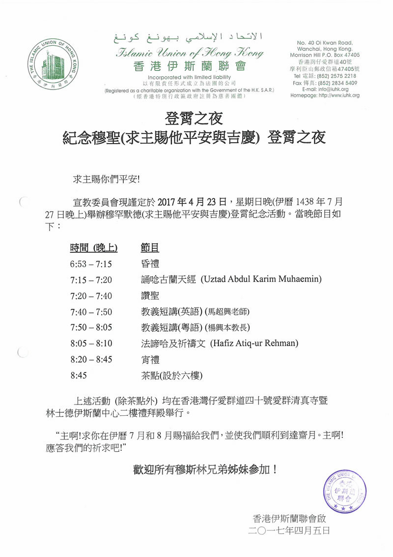 紀念穆聖登宵之夜 IUHK 2017-04-17 12:57:33 瀏覽 紀念穆聖登宵之夜 23 Apr (Sun) 7pm @ 2/F Men’s Prayer Hall 4月23日(星期日) 晚上7時 @ 二樓男禮拜殿