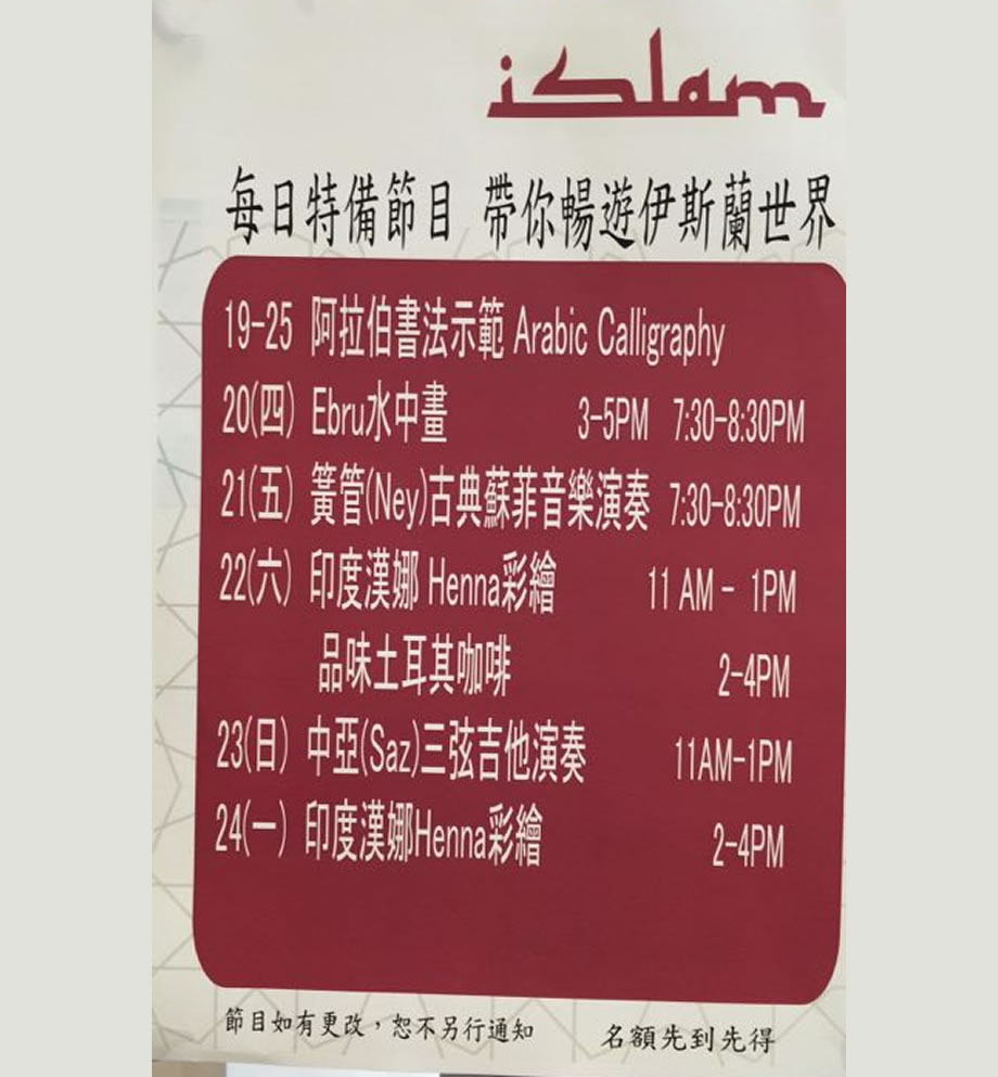 為了更好地展現伊斯蘭文化,展會期間,每日都安排有不同的表演節目,有阿拉伯語書法現場演示,可為顧客製作獨俱特色的阿語簽名,神奇的水中畫現場作畫,吸引了大量孩子圍觀,有簧管古典蘇菲音樂演奏,有印度漢娜彩繪表演,有中亞三玄吉他現場演奏,有武術表演,並備有土爾其咖啡和中東椰棗供顧客免費品嘗。