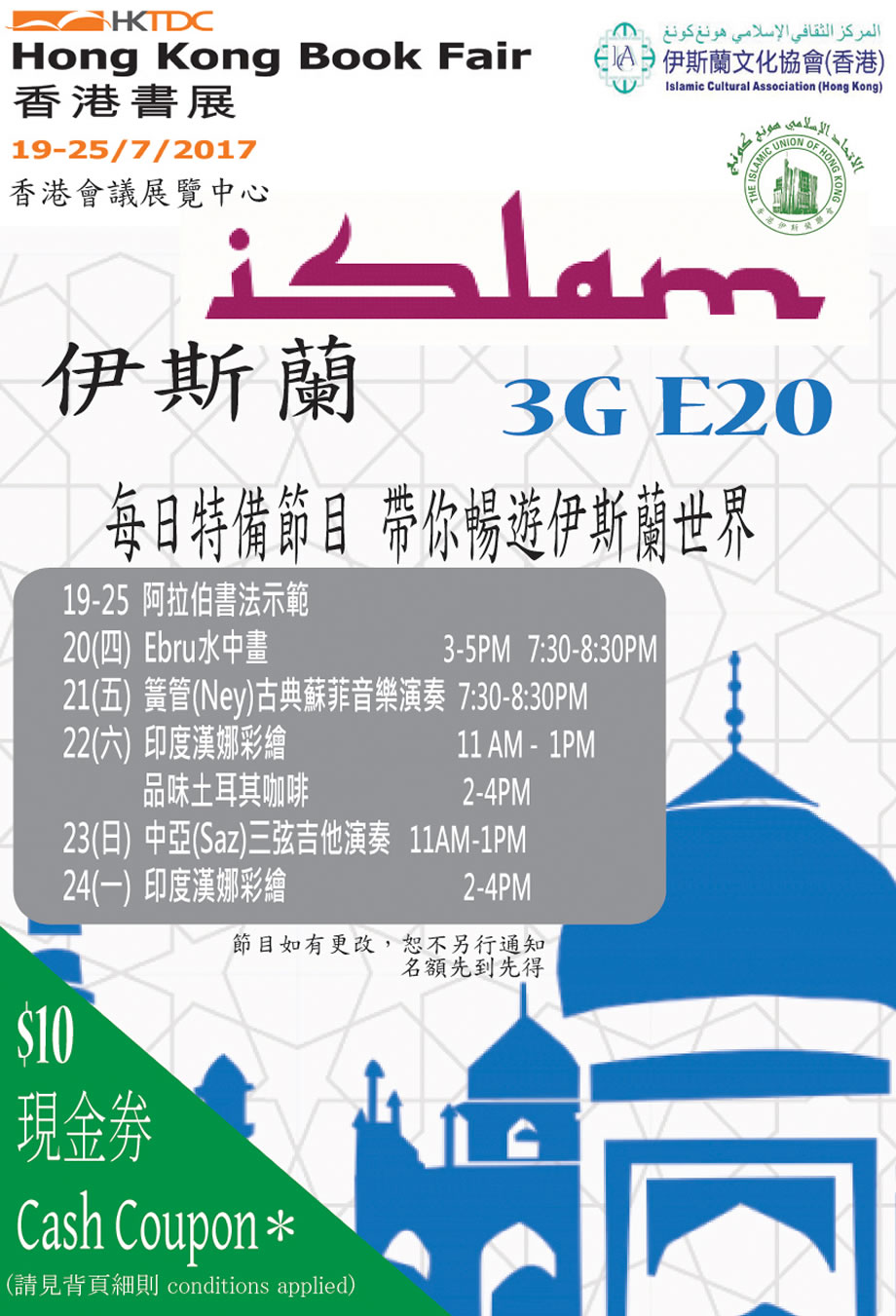 本屆書展上的伊斯蘭展臺由伊斯蘭文化協會(香港)和香港伊斯蘭聯會聯合參展,展臺設於3G號館(3樓) #E20,展臺設計具有濃郁的伊斯蘭風情。