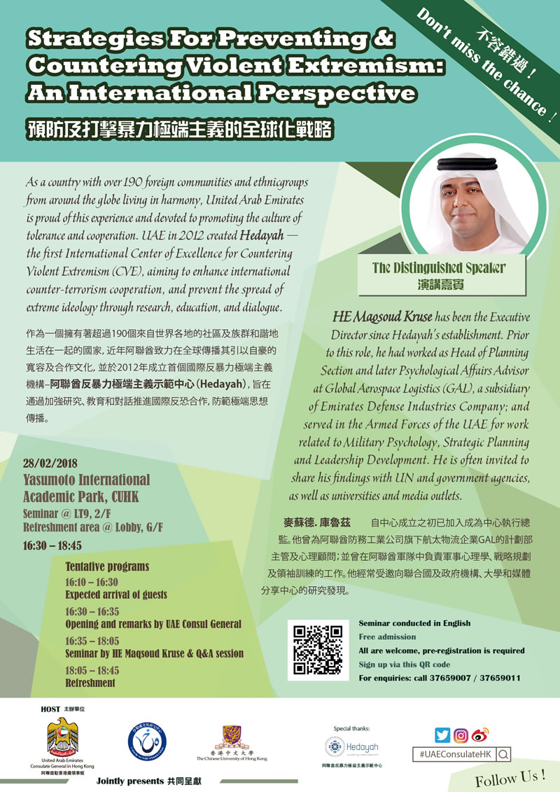 預防及打擊暴力極端主義的全球化戰略 (英語公開講座) 穆斯林 2018-02-11 13:15:30 瀏覽 UAE Consulate General HK (Host) CUHK (C0-host): Strategies For Preventing & Countering Violent Extremism: An International Perspective 阿聯猶駐港領事館(主辦)中文大學(協辦):預防及打擊暴力極端主義的全球化戰略 (英語公開講座)