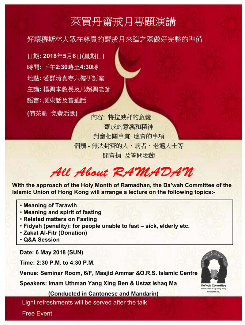 齋戒月專題演講 (廣東話及普通話) IUHK 2018-04-28 15:12:20 瀏覽 Talk: All About Ramadan (Cantonese & Mandarin) 齋戒月專題演講 (廣東話及普通話) 6 May (Sun) 2 - 4 pm @ 6/F Seminar Room 5月6日(星期日)下午2 - 4時@ 6樓研討室