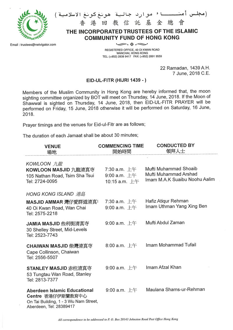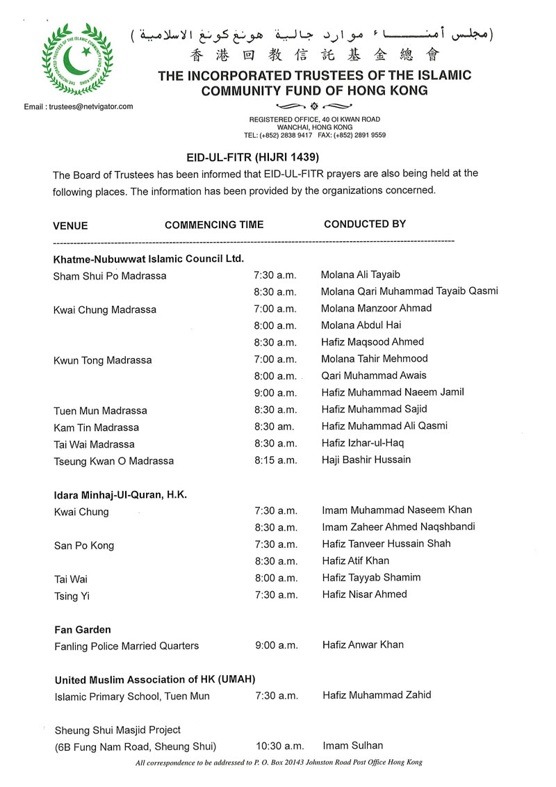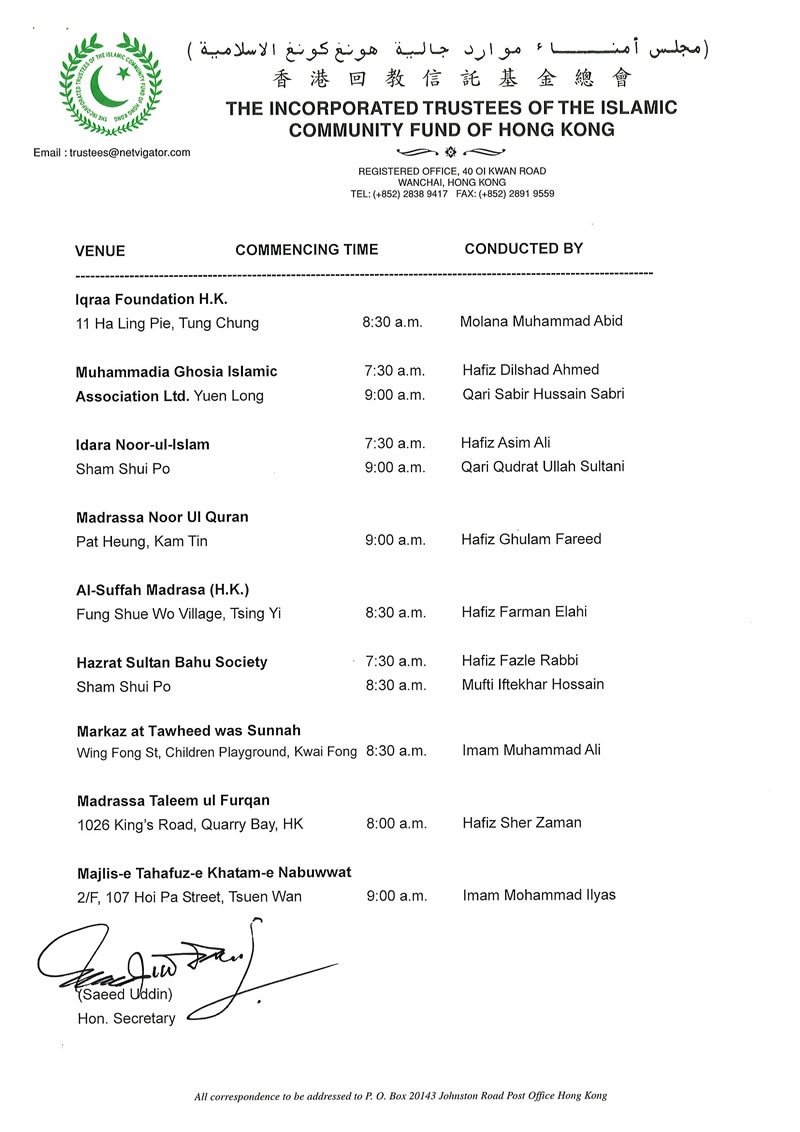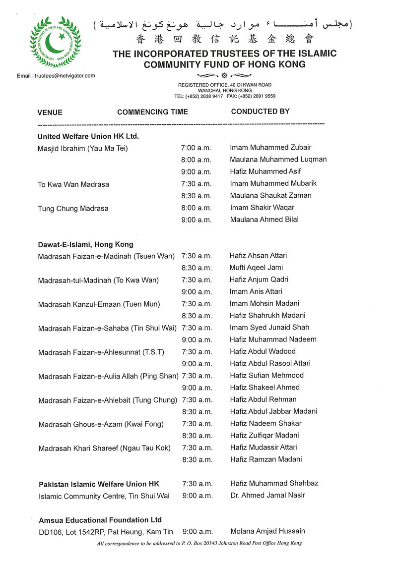 Eid-ul-Fitr Prayers Arrangement開齋節會禮安排