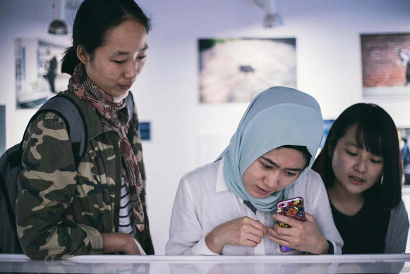 展覽開幕那天有過百人,包括非穆斯林到場支持參觀,子石(中)說,場地位於商學院,不少師生這幾天路過也駐足看看。