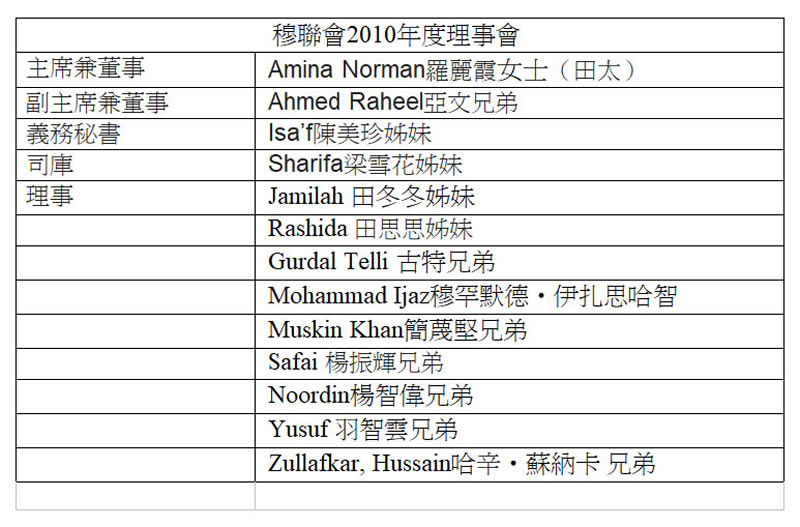 本人曾約晤個別創會會員,試圖邀請他們協助召集會員大會,再選出新理事會接班,但可惜他們都以年事已高,無法勝任為由婉拒。於是,我們轉而物識幾位教內較熱心的教胞,游說他們加入本會;最終,獲穆罕默德 義渣氏哈智(Haji Muhammad Ijaz) 、Sharifa梁雪花姊妹及Yusuf羽智雲兄弟願意加入本會協助。理事會於是增補了三位為增補理事。並決定於 2010年2月28日召開特別會員大會,選舉新一屆理事。