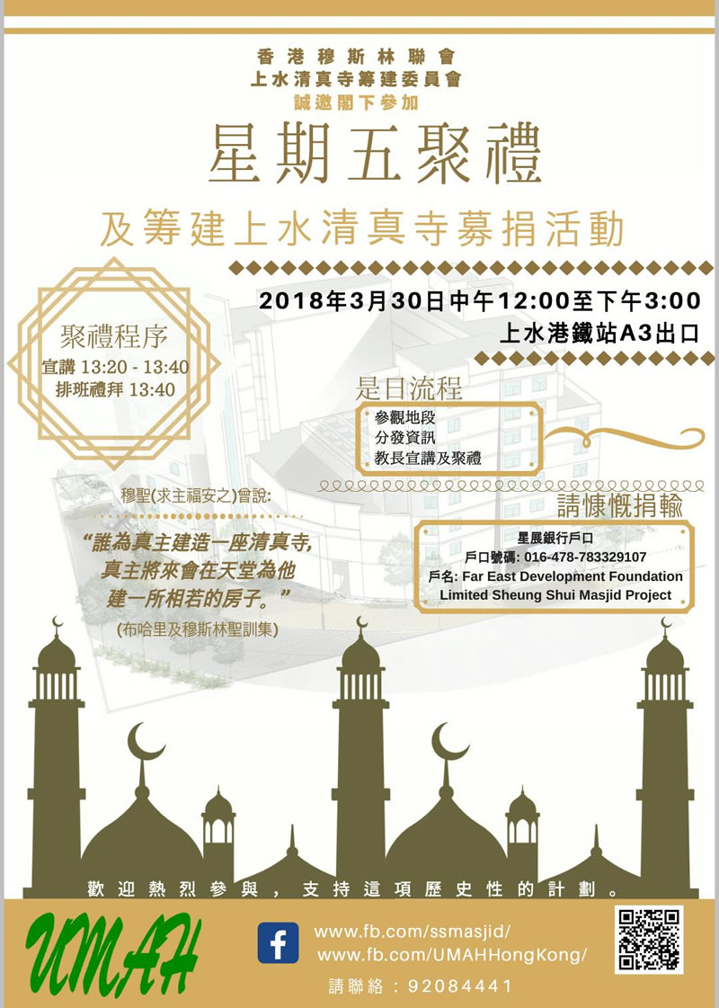在此,呼籲各位繼續支持上水清真寺的籌款運動,慷慨解囊,令工程能早日展開。祈求安拉指引及保護,並接納我們在主道上的奉獻,使我們建寺的夢想能早日實現。阿憫!
