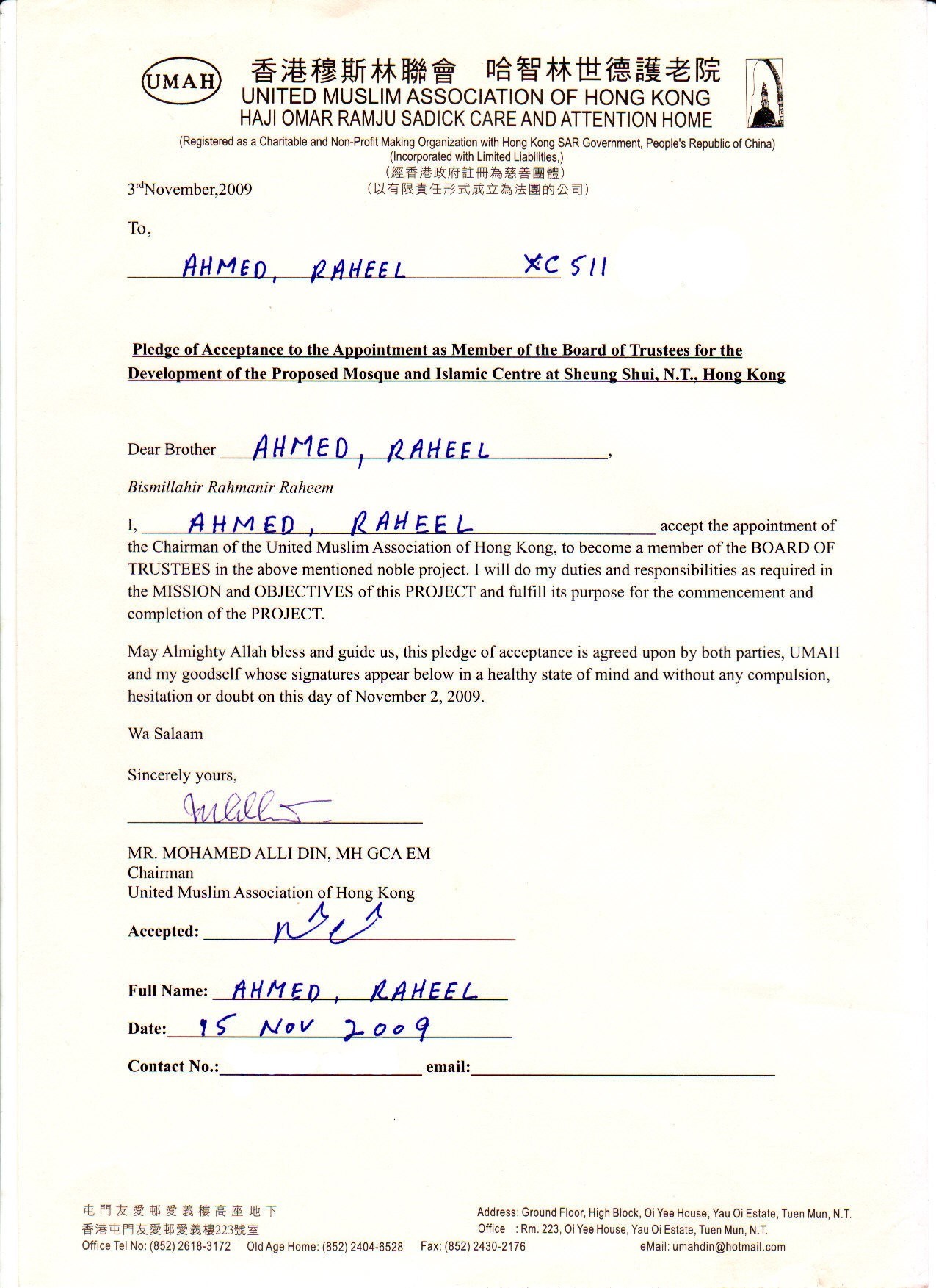 本人借此機會,向多位調解員及基金會致謝;感謝各位尊敬的教長的支持;友愛社群的熱心幫助;各位理事的堅持,對穆聯會不離不棄,尤其是家母羅麗霞女士、亞文兄弟、羽智雲兄弟等的艱苦奮鬥,克服重重困難;舍妹Rashida在極困難的環境下,堅守安老院的主管要職,確保安老院能維持正常的服務。