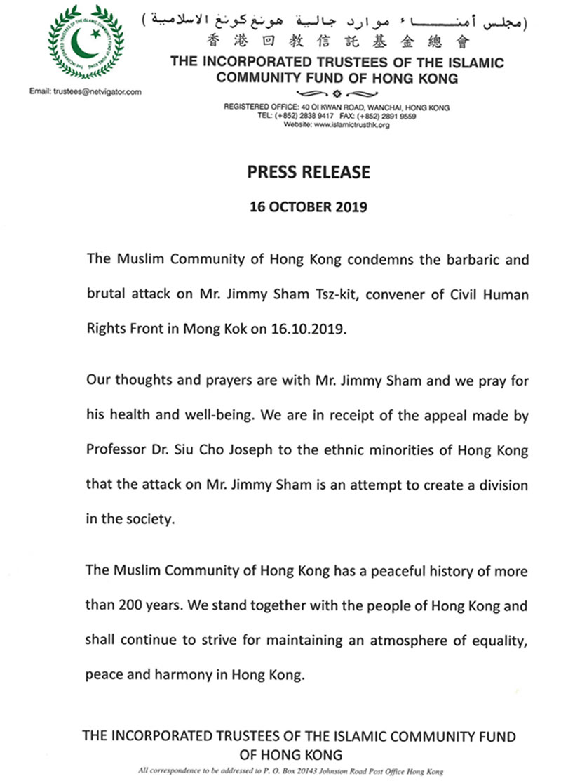 香港回教信託基金總會聲明 穆斯林 2019-10-17 18:50:21 瀏覽 香港穆斯林社羣就2019年10月16日針對民陣召集人岑子杰先生在旺角的襲擊是野蠻及殘忍的行徑,我們予以強力的譴責。 我們會為岑先生祈禱,並祝願他能早日康復。本會認同中大講師曹文傑博士的分析,是次襲擊的目的是分化社會。 穆斯林社羣在香港和平地生活,至今已有超過二百年歷史。穆斯林亦會和香港人同行,繼續為爭取社會平等、和平與和諧一同努力。 香港回教信託基金總會