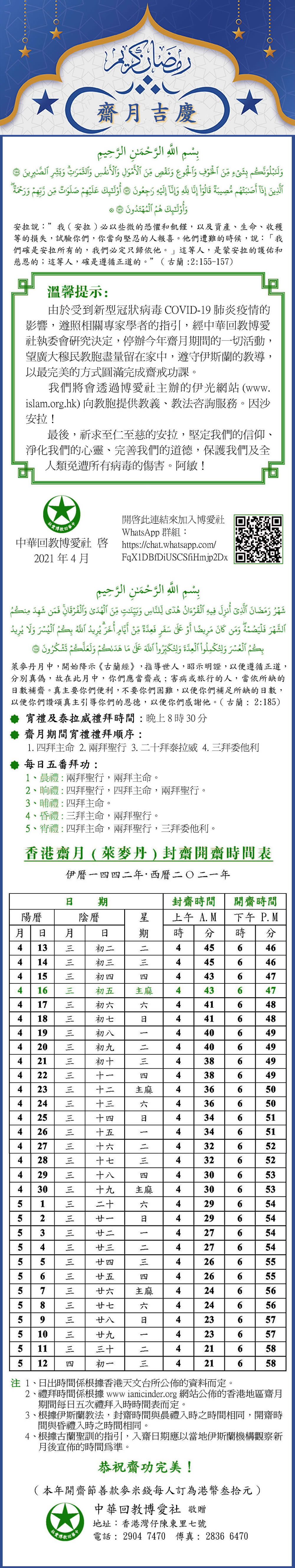 香港齋月( 萊麥丹) 封齋、開齋、禮拜時間表