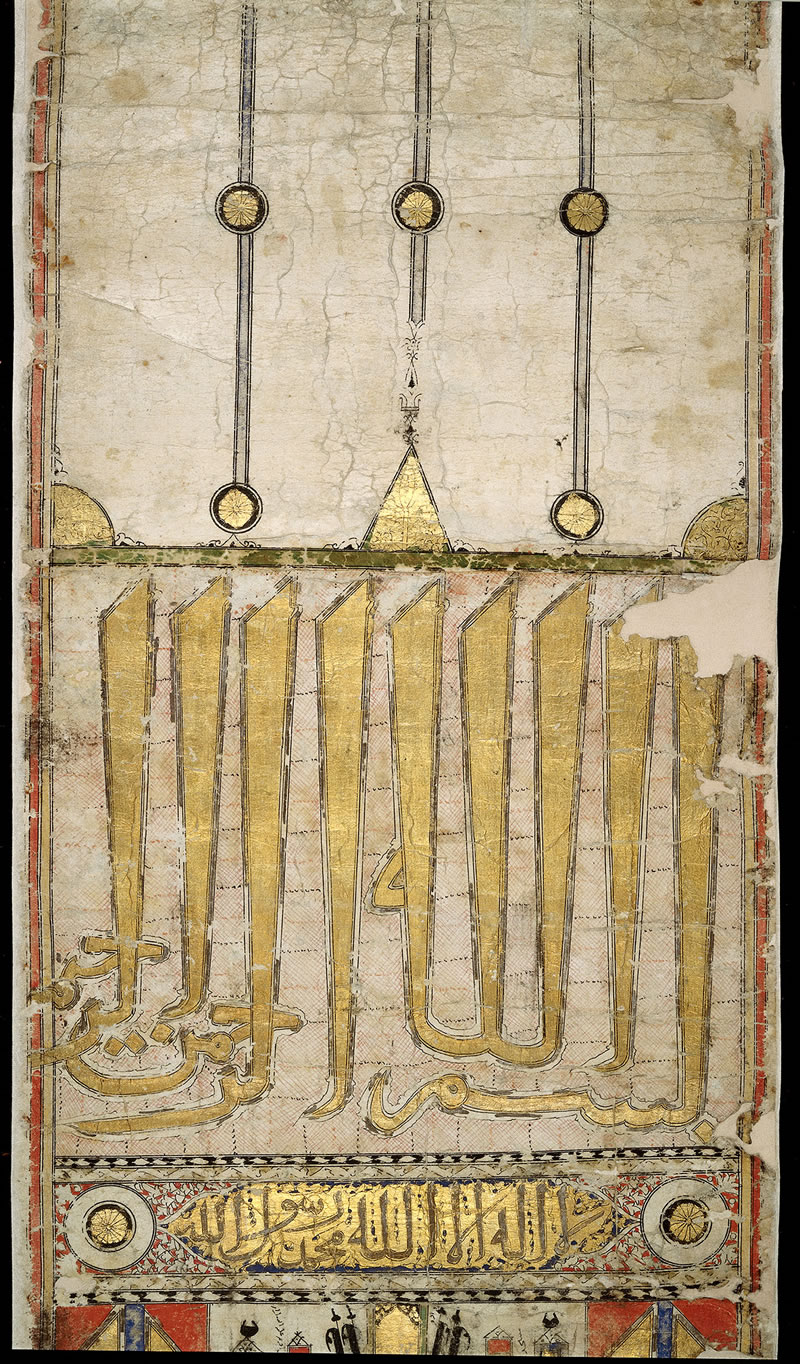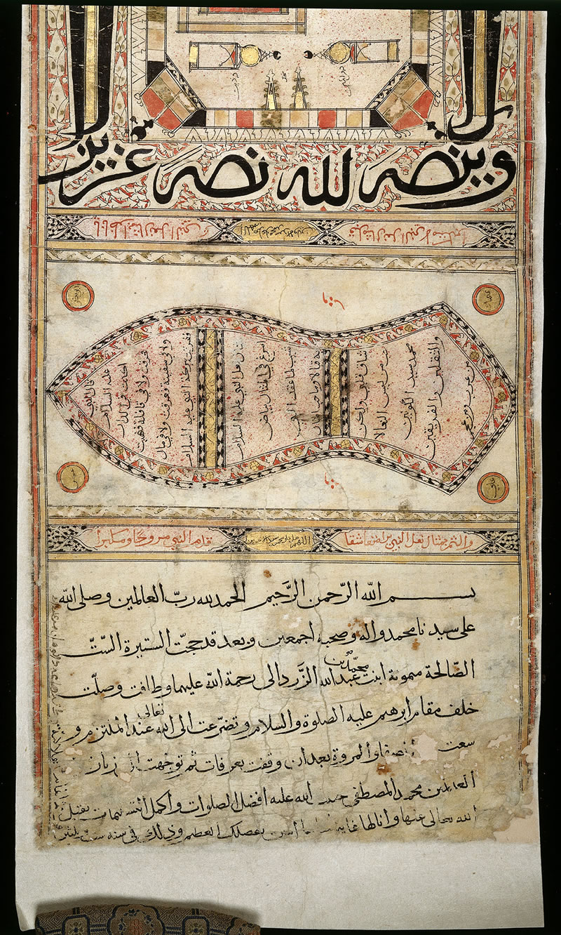 下圖是西元15 世紀頒發給朝覲者的精美卷軸,其主人是一位名叫梅穆納(Maymunah)的穆斯林婦女。卷軸上附有麥加當地及途中主要景點的繪圖,是一份集宗教和地理資訊于一體的珍貴文獻。