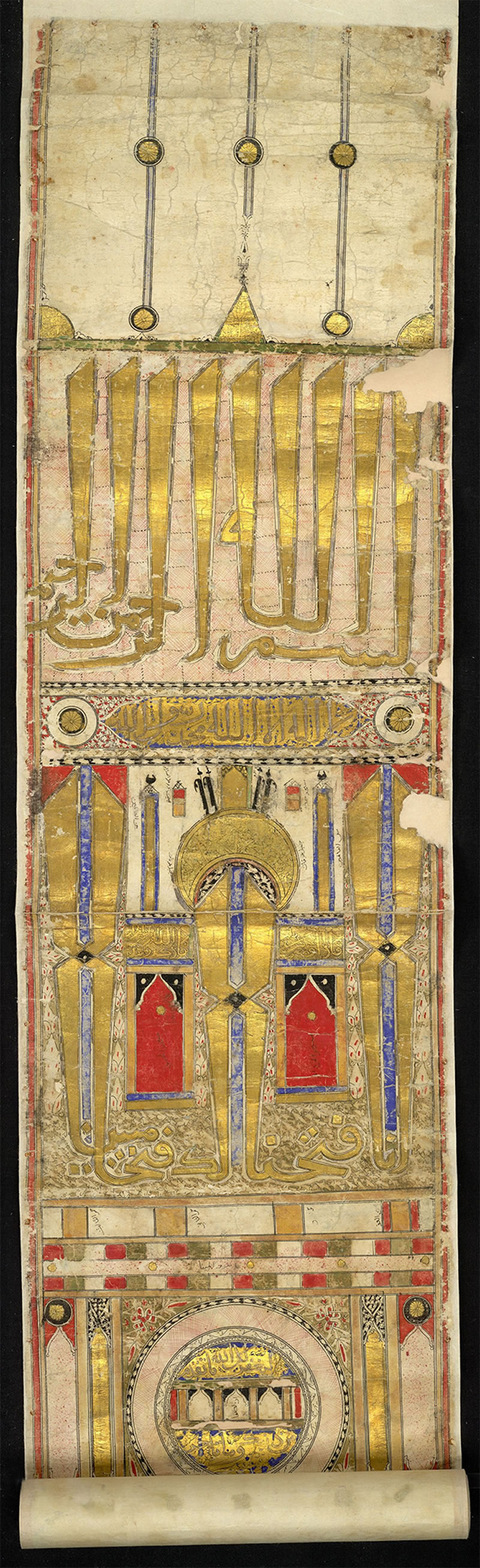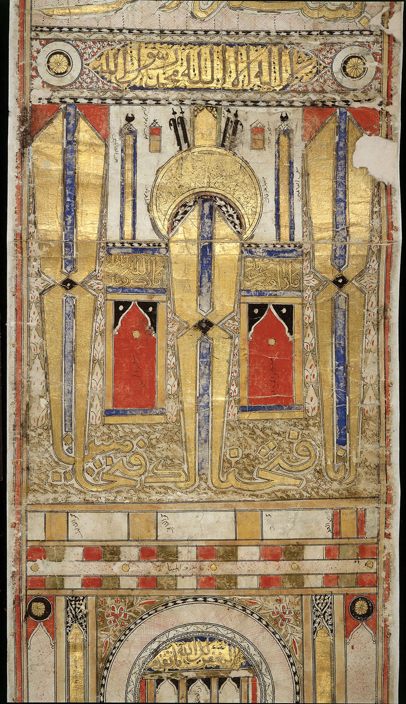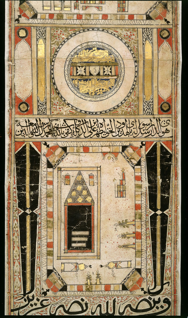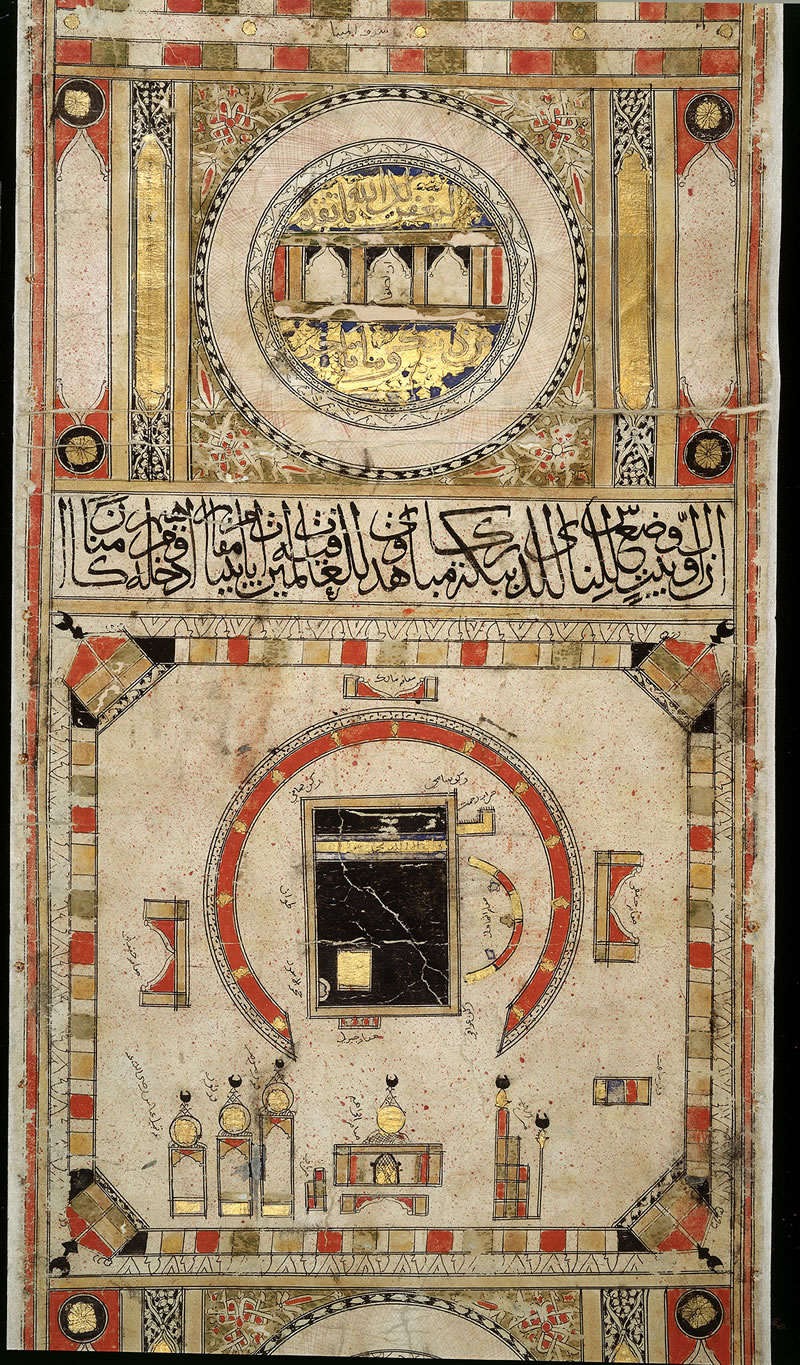 這幅長篇卷軸屬於傳統插圖,其主旨在於精准、詳細地標注、描繪穆斯林的主要聖地。繪製該朝覲卷軸的藝術家也描繪並標注了包括先知陵墓在內的著名墓地,以及其他受穆斯林敬仰的地標。卷軸中阿拉伯字體的書法條帶,是古蘭經中關於朝覲等內容的經文。