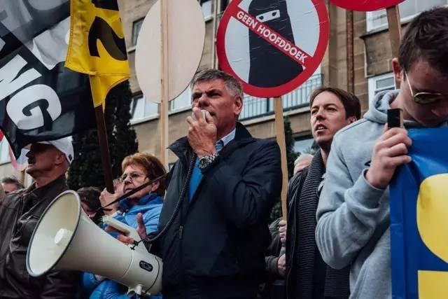 大約40多個佛蘭芒政黨的支持者在週六下午兩點舉著牌子從展覽中心那裡穿過馬路集合在一起,打出“禁止戴頭巾”、“停止宣傳伊斯蘭”、"不要清真寺"等標語,還派發香腸切片以賄賂路人。