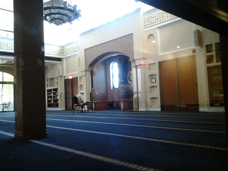 次日再次尋找,發現一處真正的清真寺。大圓頂上星月標誌,周圍四角邦克樓尖塔。入內後,見到幾位阿拉伯男女穆斯林,我們以阿拉伯語互相問安,賓至如歸。我獨自在大殿做“杜哇”,舉意,默念吟誦祈禱詞,祈求真主賜我健康和智慧!祈求真主賜我的兒孫在這片土地上平安、繁衍生息!這裡穆斯林都是約旦的阿拉伯人,清真寺建於“911”事件後,對外名稱為“伊斯蘭文化中心”。離開時,那位老年穆斯林婦女還用英語詢問我的拍攝,當即我將平板電腦打開,讓她觀看所攝幾張相片,僅是大殿、水房和電子顯示禮拜時刻表,她放心地認可,我才告辭而去。時值午後一時許,好幾位約旦穆斯林驅車趕來午拜。由此可見,清真寺對外低調和對拍攝的謹慎,他們的無奈和小心,折射出美國穆斯林生存之不易。