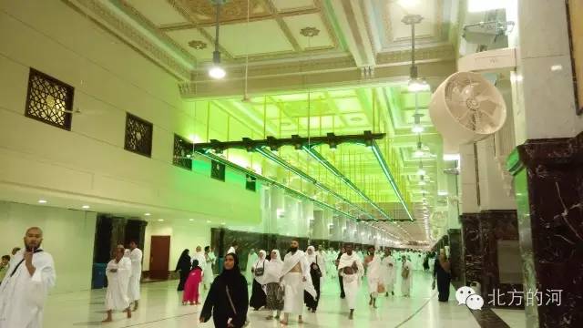 如今薩法與瑪爾沃,兩座小山都被一個雄偉的廊式建築罩了起來。聖地裡唯有此處備有空調。在習習微風的吹拂下,赤足走在冰涼的大理石通道上,雖然有些累但非常愜意。從薩法出發,在瑪爾沃轉身,七趟一共三公里半。長廊上面裝著一段綠色的頂燈,每當綠燈照射頭頂,不是女人而是那個哭泣在焦旱礫石之間的小孩——男人們要立即跑起來,跑步通過綠燈路段,如兒子向母親感謝養育的恩情,而女人只需慢慢走過七趟,紀念她們的表率。