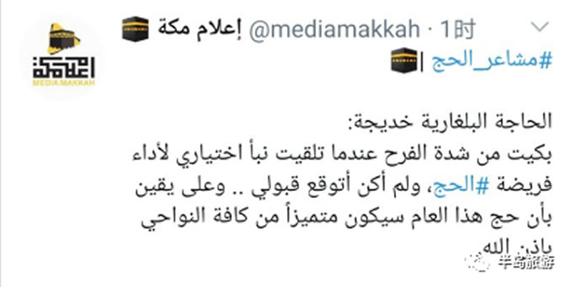 當我收到被選拔參加今年朝覲的消息時,我喜極而泣,我根本沒有想到自己(報名)會被接受… … 真主意欲,無論從各個方面今年的朝覲都將是獨特的。