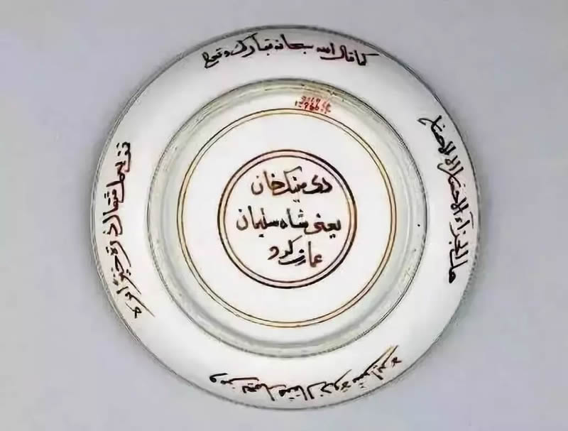 故宮博物院藏有的白釉紅彩阿拉伯文波斯文盤,盤底三行波斯文意為“大明皇帝即蘇萊曼國王禦制”