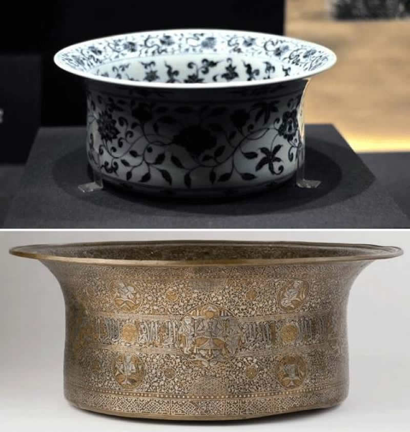 青花折沿大盆(下圖上),源于中東穆斯林的金屬淨手盆(下圖下)。