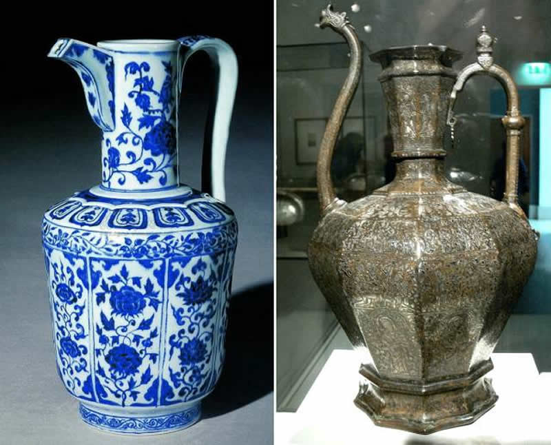 青花執壺(下圖左),也是源自 12 世紀西亞開始流行的金屬執壺造型(下圖右)。