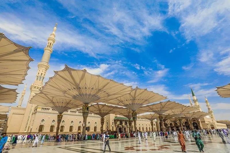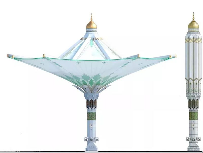 原來,在聖城麥迪那聖寺外廣場就有著這樣的遮陽傘。據瞭解,這種遮陽傘長26米,寬26米,高30米,它是結合路燈功能為一體的精密機械結構,由德國和日本的頂級公司設計和施工製造的。豔陽高照時,廣場上200多把巨型遮陽傘便會自動打開,如同一朵朵盛開的花。它不僅可以自動開合,而且還配備了溫控設備和防水技術,可降低傘下溫度,使朝聖的信徒們免受高溫烘烤和烈日灼曬之苦。