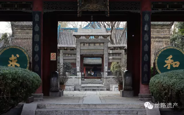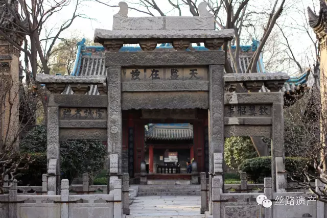 進入寺門為第壹進院落,東面為青磚大照壁,正中為磚雕圖案,頂部覆以藍琉璃瓦,檐下施磚雕鬥拱。照壁後面為木牌坊,琉璃瓦頂,鬥拱層疊,牌坊正中刻有“敕賜禮拜寺”五個大字。