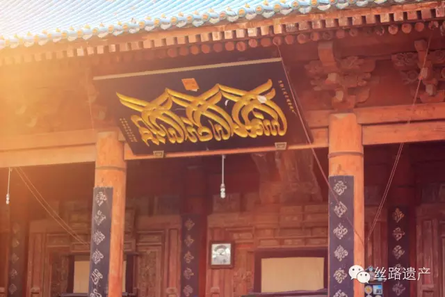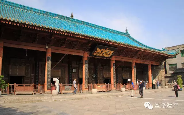 月臺西端是禮拜大殿,可容納千余人禮拜。該殿由禮拜殿、後殿組成,平面呈“凸”字形,面闊七間,進深九間,通面闊為33米,通進深為38.5米,單檐歇山頂,孔雀藍琉璃瓦屋面。殿身前檐帶廊,檐下施鬥拱,門楣正中掛有“臨下有赫”匾額。殿內設天花,上繪阿拉伯文圖案。殿內西壁設有壹壁龕,北側還有壹木制小樓閣。後殿壁上有板雕蔓草花紋,內套雕阿拉伯文。另外寺內前後保存有多處磚雕花墻。