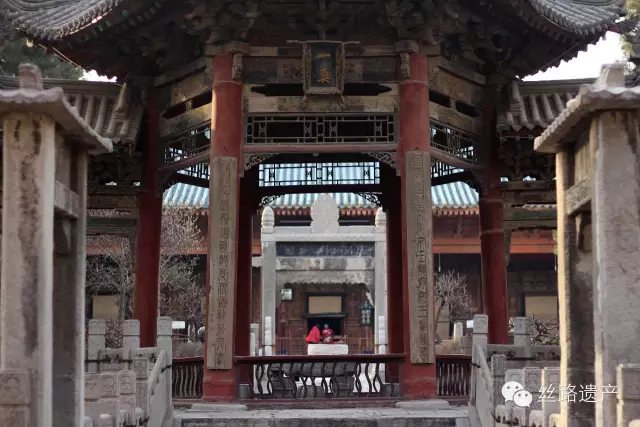 第二進院落門廳有壹座面闊五間的硬山式穿堂,又稱五間樓。院中央為四柱三間石牌坊,中楣上刻有“天監在茲”四字,周繞以石欄桿。在其西側豎有大石碑兩座:壹為明萬歷三十四年(公元1606年)立的“敕賜重修清真寺碑”,碑文為明末西安地方的著名學者馮從吾撰寫,碑陰刻有宋代著名書法家米芾手寫的“道法參天地”五字;壹為清乾隆三十三年(公元1763年)立的 “敕修清真寺碑”,碑陰刻明代書法家董其昌書寫的“敕賜禮拜寺”五字。