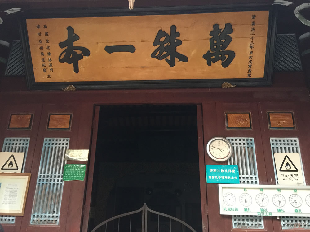 明善堂大門上額,懸掛廈門關監督唐柯三於民國十一年(1922年)題寫橫匾“認主獨一”。大門內上端掛著一匾額,亦是唐柯三調任山東濟南道道尹後,於民國十三年(1924年)六月敬立的,文曰“三畏四箴”。從伊斯蘭教義解釋,三畏即“畏天命、畏聖言、畏末日”,四箴即“箴信真主安拉、箴順先知穆罕默德聖人、箴遵天經《古蘭經》、箴行五功”。